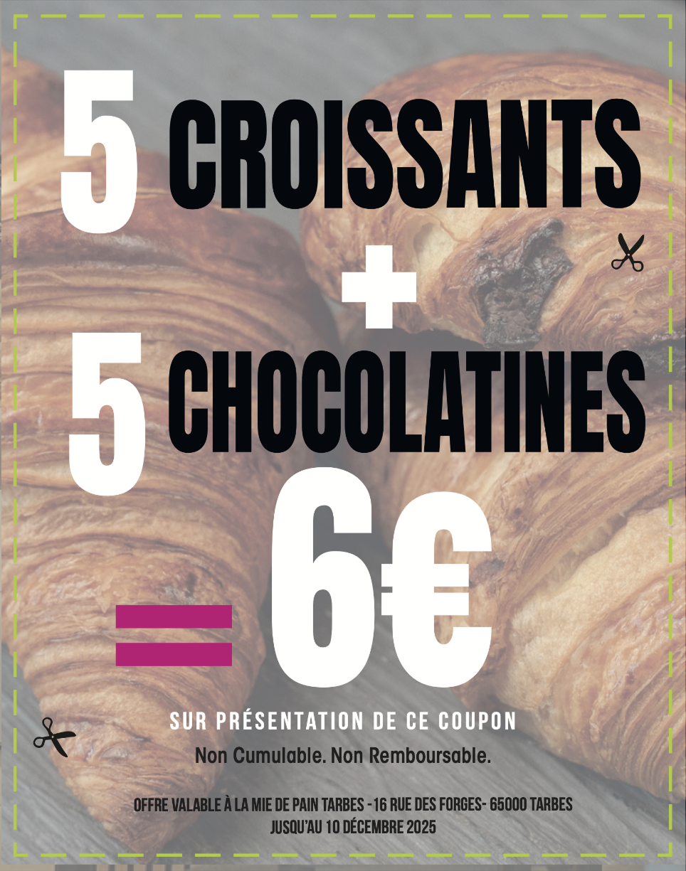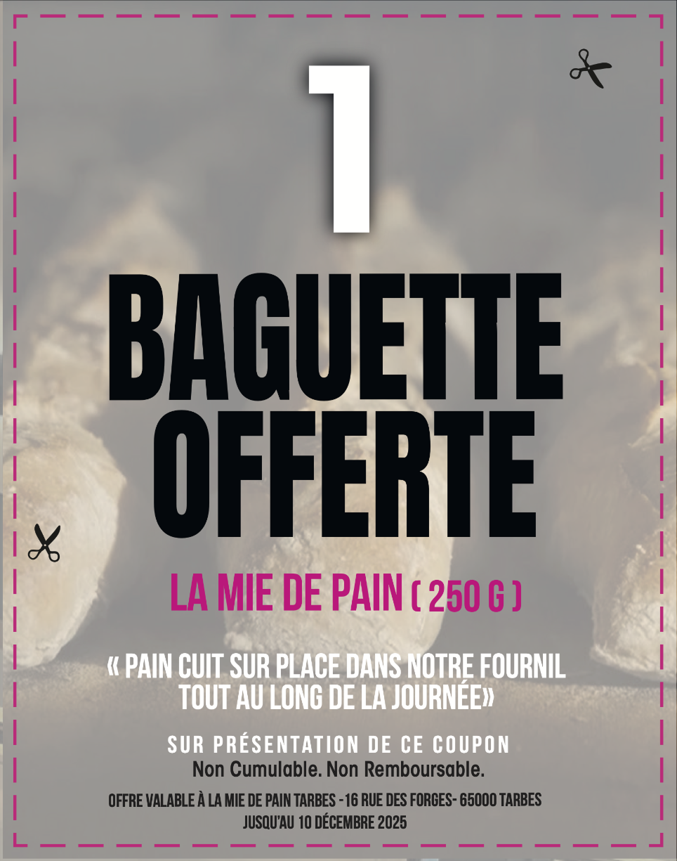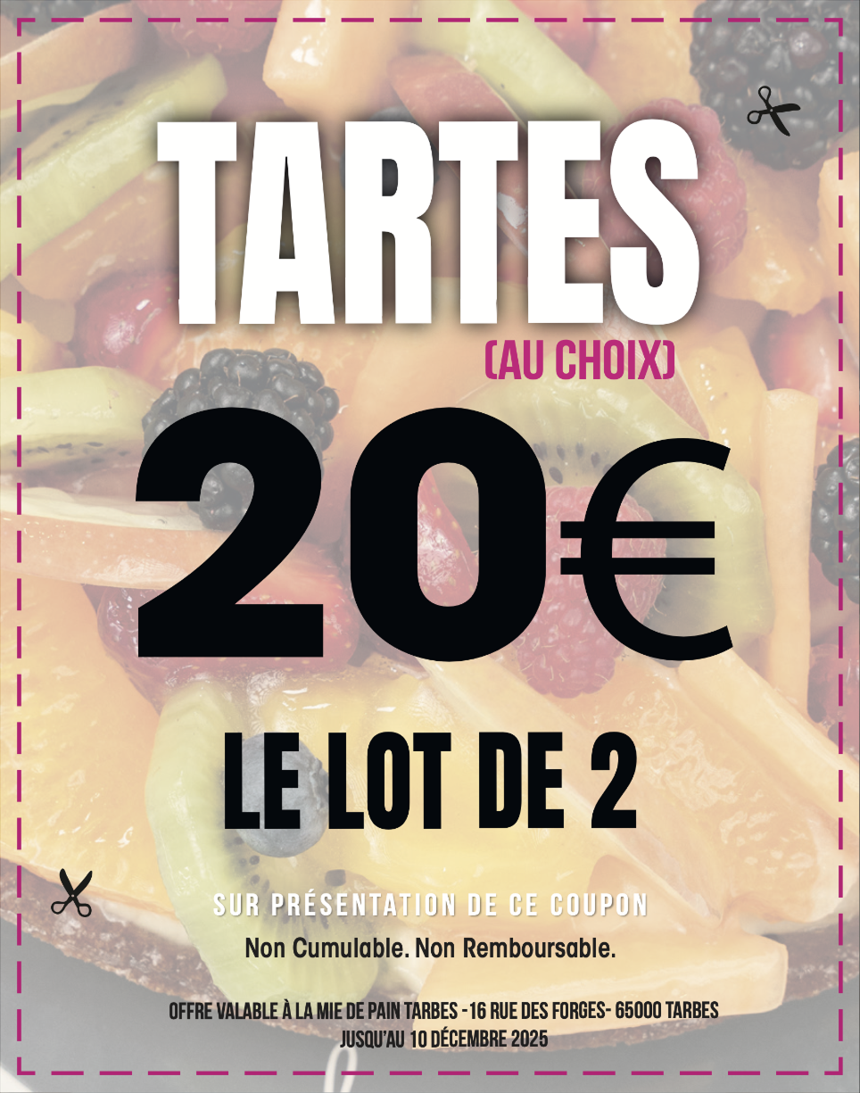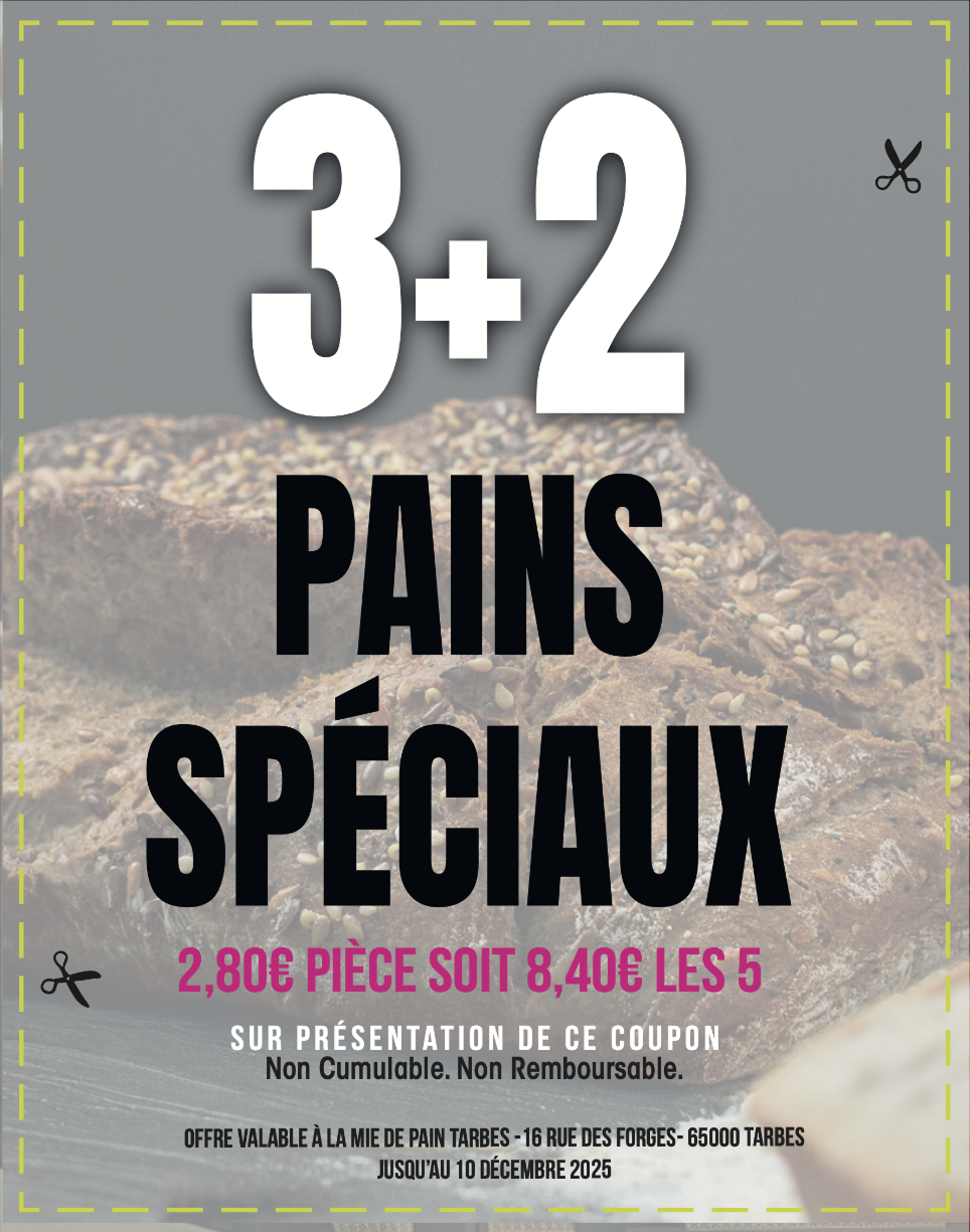 TÉLÉCHARGEZ & PARTAGEZ NOS OFFRES GOURMANDES AVEC VOS COLLEGUES, VOS AMIS, VOTRE FAMILLE ! OFFRES VALABLES À LA MIE DE PAIN TARBES UNIQUEMENT SUR PRESENTATION DES COUPONS À TÉLÉCHARGER